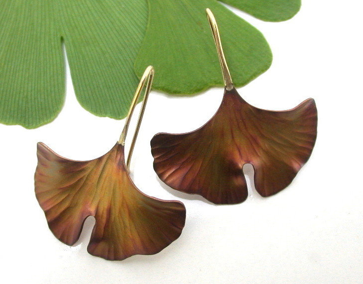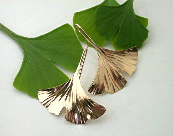 Designing and creating Ginkgo leaf jewelry first occurred to me one day in 1977 as I sat under a Ginkgo tree at the University of Chicago playing with a Ginkgo leaf. I was one of the first jewelry artists to use this leaf as inspiration, and I am forever indebted to the Ginkgo tree for my success. My classic Ginkgo leaf earrings, ginkgo pins, and ginkgo pendants have remained best sellers all these years. My work has been sold in many fine shops and galleries in the USA for over 30 years. Examples of my Ginkgo leaf jewelry are shown below in various sizes, and metals. Every piece of Ginkgo jewelry is individually hand crafted by the artist, hand forged, using a hammered texture which reflects the design of Nature's own Ginkgo leaf. No two pieces are exactly alike, therefore all measurements shown are approximate. Earwires on the copper earrings are gold-filled. In over 30 years of experience with customers, gold filled has proven to be safe for those with allergies to nickel and other base metals. Our work is guaranteed. Purchase